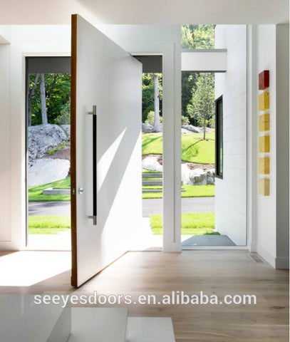 Product Description           Product name entrance door /front door /pivot door Material solid wood( teak/ mahogany, /cherry /walnut/ ashtree/ red oak/ white oak),Melamin, MDF/HDF, WPC Door thickness Door leaf thickness:45-70mm frame size:50-60mm(wall thickness according to location) Door size customized Surface finished painting Open style 1. open...