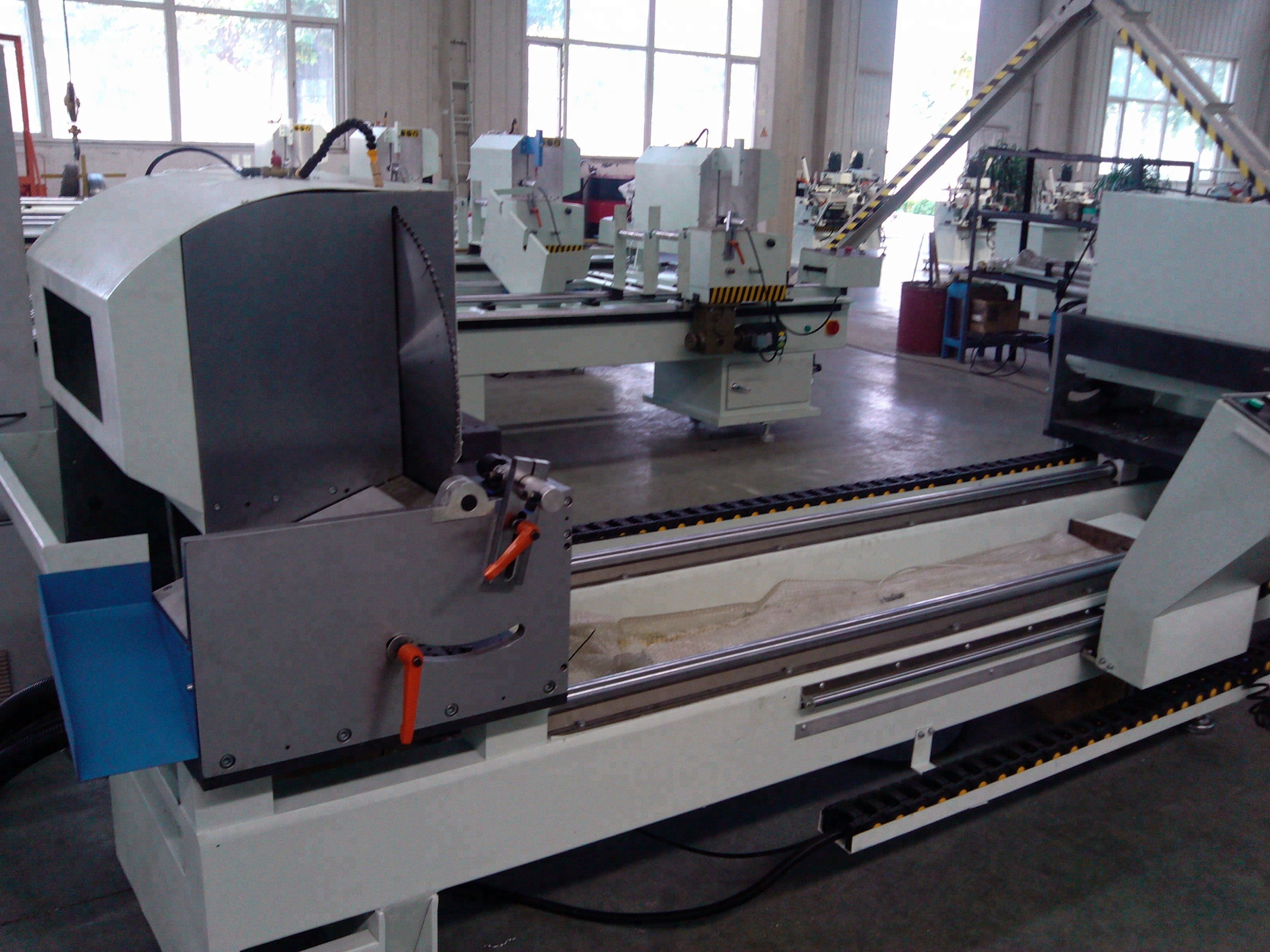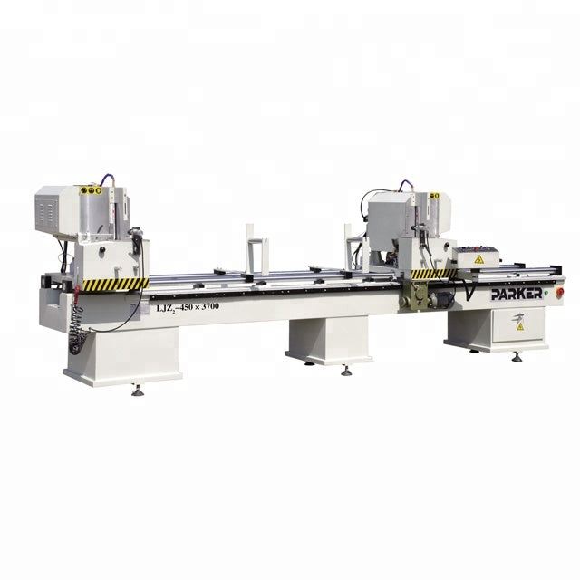 machines for making upvc windows / double head cutting saw machine   Model:   LJZ2-450×3700 Features: Imported carbide saw blade give accurate processing and high endurance. Saw blade rotate smoothly due to high accuracy main spindle. Uniform speed feeding and smooth motion due to air-hydraulic damping cylinder. Used for cutting aluminium at -45°,90°and 45° One time processing can cut off the required length. The safety devices designed specially clamp the devices when power is cut off suddenly. So the safety of operators is assured. Parameters: Other Upvc & Aluminium Window Door Machines:     Factory: Samples:  Exhibitions:  Factories of Customers:  Customers Visit:  Parker Service Team:  Packing &...